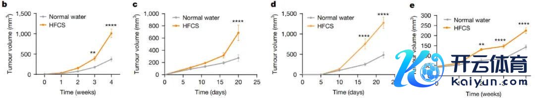 此外,为了探究果糖是不是只“偏疼”玄色素瘤,链接者决定“换谈推行”,乳腺癌、宫颈癌模子十足安排上!他们分离在小鼠乳腺脂肪垫中植入E0771乳腺癌细胞,宫颈部位植入抒发HPV-E6/E7的TC-1细胞,还在免疫劣势的裸鼠中植入了CaSki宫颈癌细胞。通盘模子中,推行组小鼠的饮食均补充了HFCS,而对照组饮食则未含果糖。为止知道,不管肿瘤类型或位置,HFCS组的肿瘤滋长均快于对照组。何况,就算在免疫劣势的裸鼠身上,果糖的促癌效应仍然显耀,标明其作用并不依赖于宿主免疫状况。